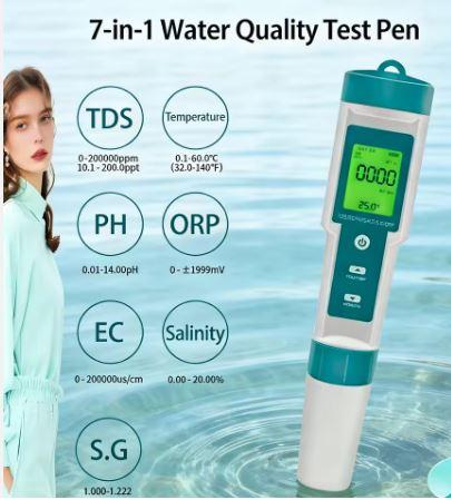 Medidor digital de calidad de agua 7 en 1. Este dispositivo portátil mide siete parámetros clave: TDS, temperatura, pH, ORP, conductividad (EC), salinidad y gravedad específica (S.G).
