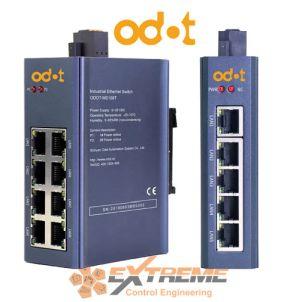 Switches industriales ODOT: Ethernet no gestionados, 5/8/16 puertos 10/100Mbps auto-negociación, compatibles IEEE 802.3/802.3u/802.3x. Alimentación 9-36V DC, montaje riel DIN 35mm, carcasa IP20. Operación -20°C a 70°C, protección anti-reversa, tormenta broadcast y ESD 2KV. Plug-and-play, ideales para automatización, IoT y redes industriales robustas. Garantía 3 años, integración sencilla con PLC, SCADA y sistemas OpenPLANT.